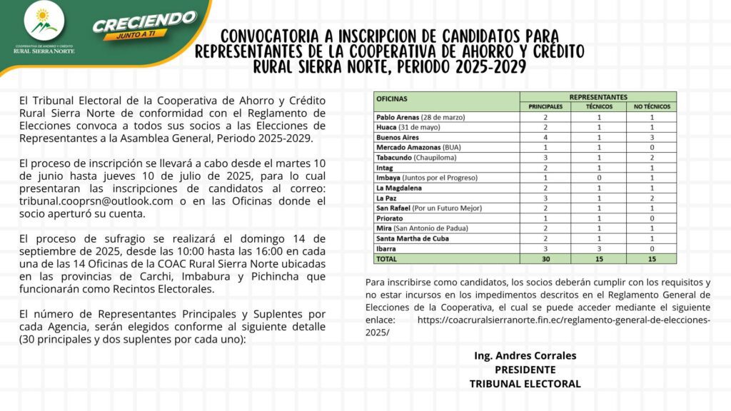 Forma parte de nuestro proceso democrático para la Asamblea de Representantes de los socios, una oportunidad de ser parte de nuestro crecimiento y gestión cooperativa. #CreciendoJuntoATi