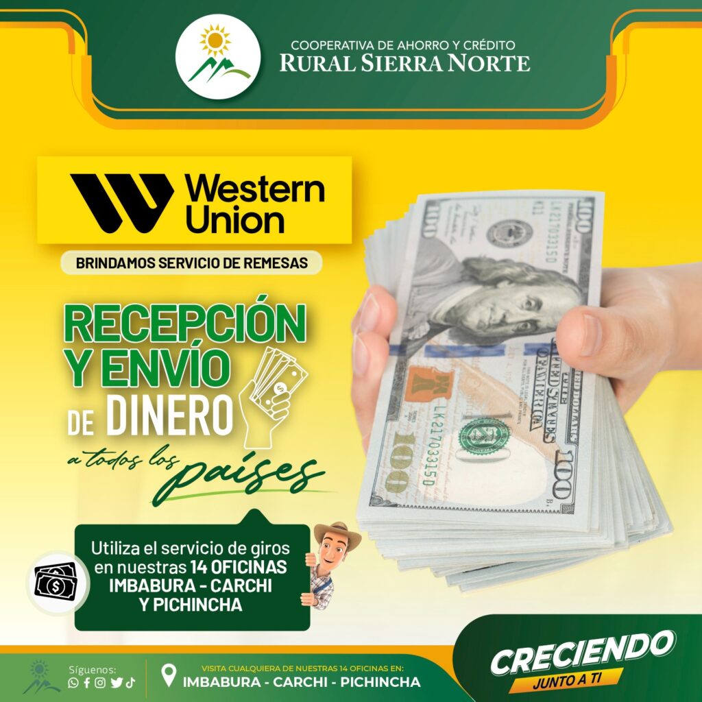☺️Ahora con tu Cooperativa de Ahorro y Crédito #RuralSierraNorte puedes enviar o retirar tu dinero en el exterior, las 24 horas del día, los 7 días de la semana con Western Union✨